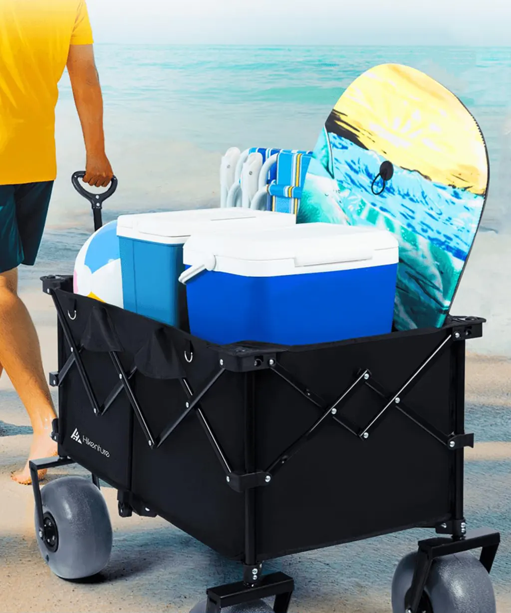 Hikenture Collapsible Wagon Cart, 330lbs Capacity Beach Wagons with Big Wheels for Sand, Heavy Duty Foldable Cart with Brakes, Portable Utility Folding Garden Cart for Outdoor(Black)