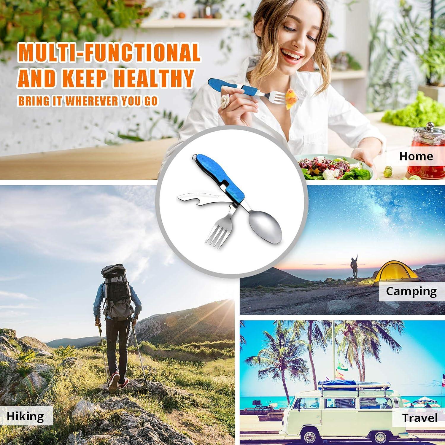 Camping Utensils 2 Pack,HIKENTURE 4-in-1 Stainless Steel Spoon, Fork, Knife, and Bottle Opener Combo – Lightweight and Portable Travel Eating Silverware for Hiking, Backpacking, and Picnic (Red 2pack)(Blue)