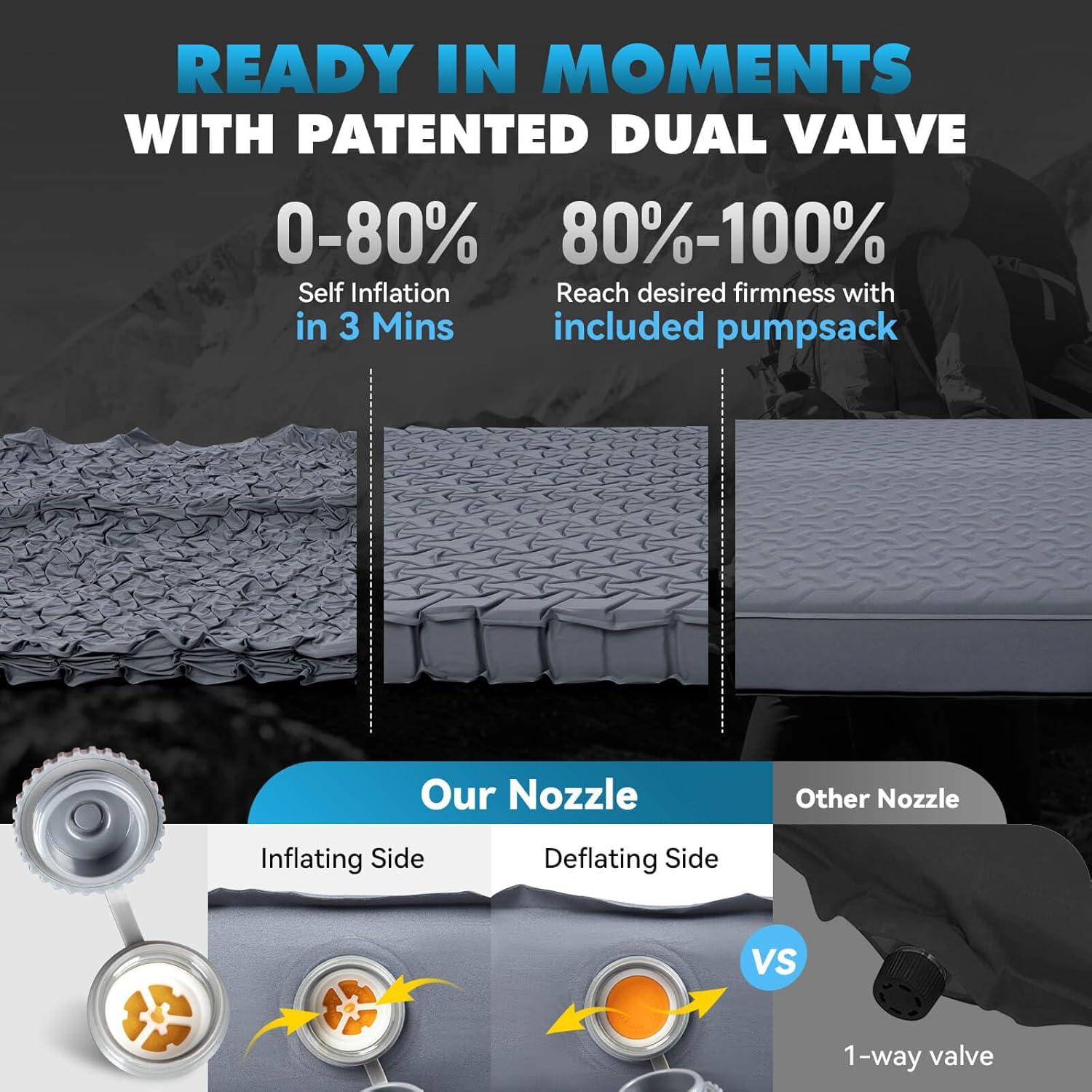 4-INCH BODY-HUGGING CLOUDS – Experience cloud-like comfort with our ultra-thick self-inflating sleeping pad, boasting a generous 4-inch thick foam filling. The adaptive support cradles hips/shoulders while resisting bottoming-out, whether you're side-sleeping in a tent, RV-camping, or hosting backyard guests. Wake up refreshed, not achy – your adventure-ready body deserves this upgrade!