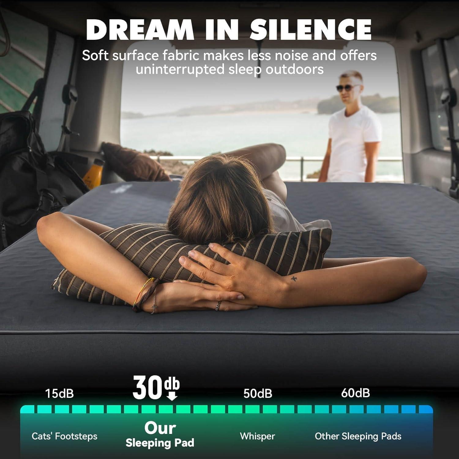 WHISPER-QUIET NIGHTS UNDER STARS – Our camping sleeping pad with stretch-knit fabric surface combines whisper-soft comfort with noise-free movement. No more crinkly plastic sounds ruining your wilderness zen! Roll over freely without waking tent mates – Our camping mat is ideal for light sleepers and family camping trips where peaceful sleep matters most.