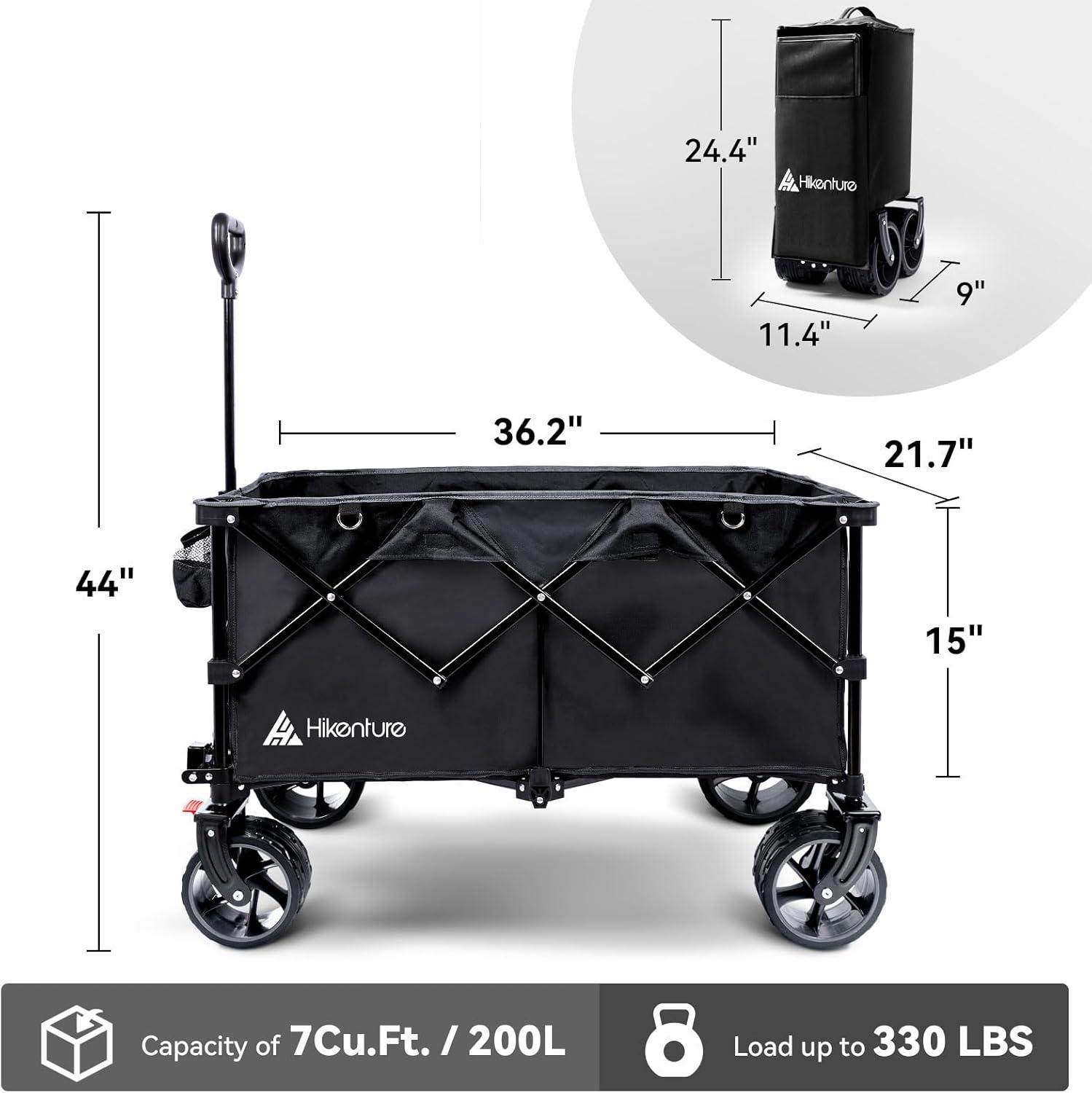 Hikenture Collapsible Wagon Cart, 330lbs Capacity Beach Wagons with Big Wheels for Sand, Heavy Duty Foldable Cart with Brakes, Portable Utility Folding Garden Cart for Outdoor(Black)
