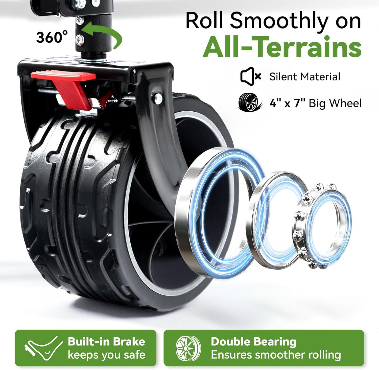 ๐-๐๐๐๐๐ โ ๐๐๐๐๐๐๐๐ ๐๐๐๐๐๐ ๐๐๐๐๐๐๐ ๐๐๐ ๐๐๐๐๐๐๐๐ – Super large 4″ wheels with unique anti-slip pattern make our collapsible wagon extremely capable of transporting load on multiple terrains, including sandy beach, grass and even rough terrains. The wheels of our beach cart are significantly wider than similar folding carts, resulting in dramatically better steering. The dual front wheels are 360-degree rotatable for easy maneuvering.