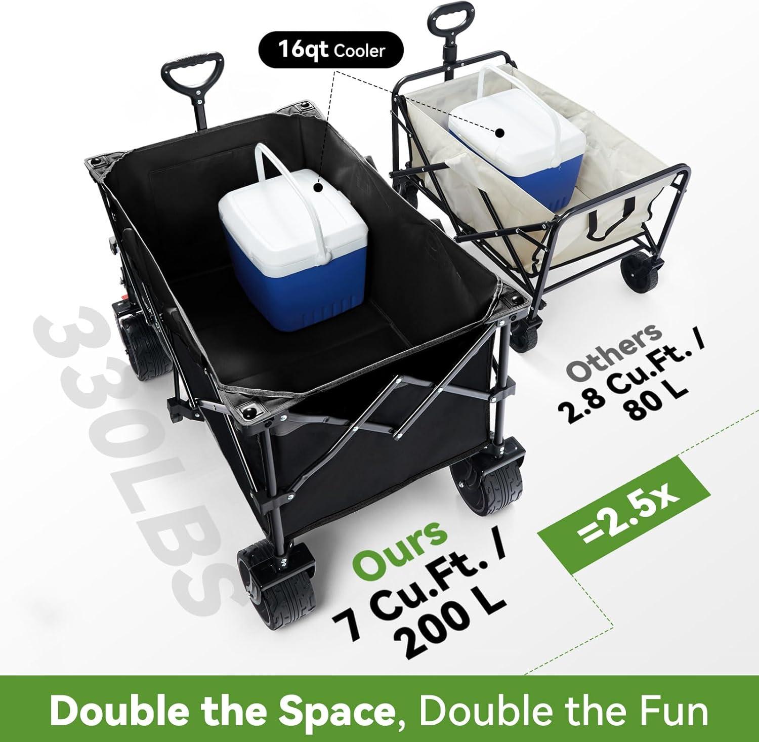 ๐-๐๐๐๐๐๐ โ ๐๐๐๐๐ ๐๐๐๐๐๐๐ โ You could hardly find a larger one. Our beach wagon is designed to be a real carryall. With a deeper and larger storage space, our wagon cart stands out from others thanks to its surprisingly enlarged capacity of 200L / 7 cubic feet, which means 3-4 times the capacity of a 24-inch suitcase or 5-7 times of a 20-inch suitcase. Just load it with everything you need and enjoy a nice adventure in the sun!