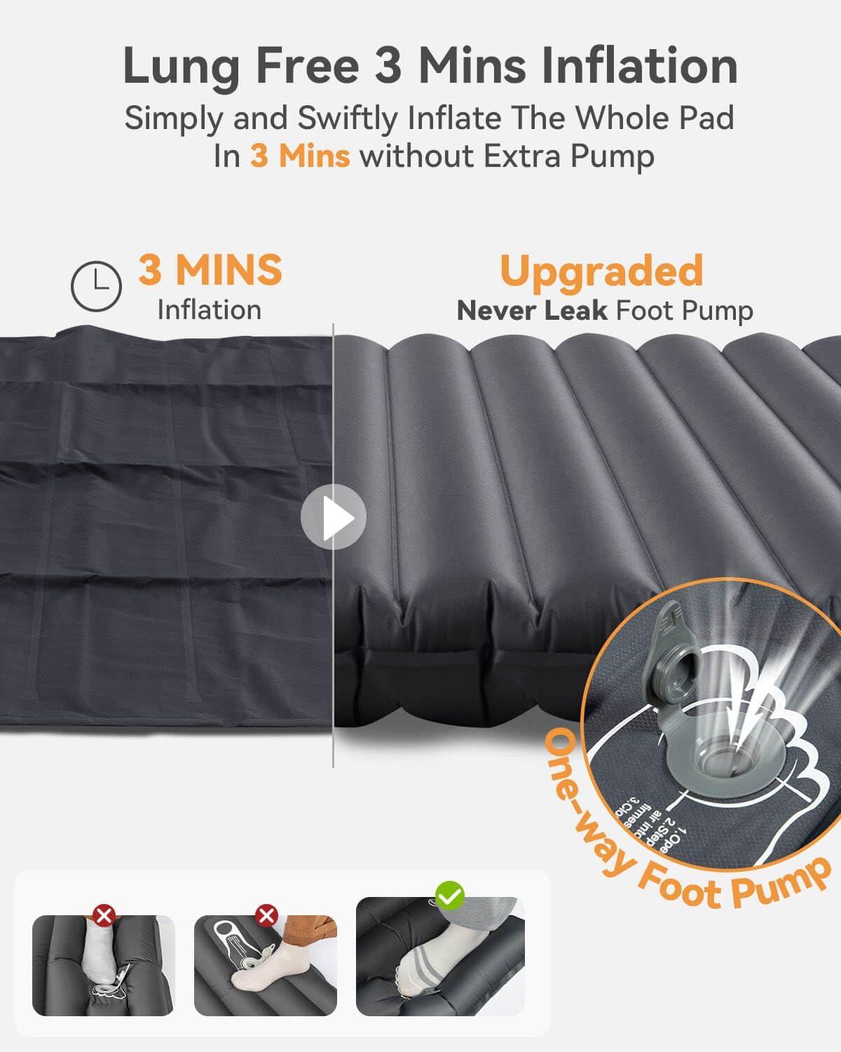๐๐๐๐: No additional pump or breath required, save your time and efforts to get a better sleep after a rough journey! Each camping pad equibbed with 2 valves, one for easy inflating with your foot or hand within few minutes, another for rapid inflation and deflation.