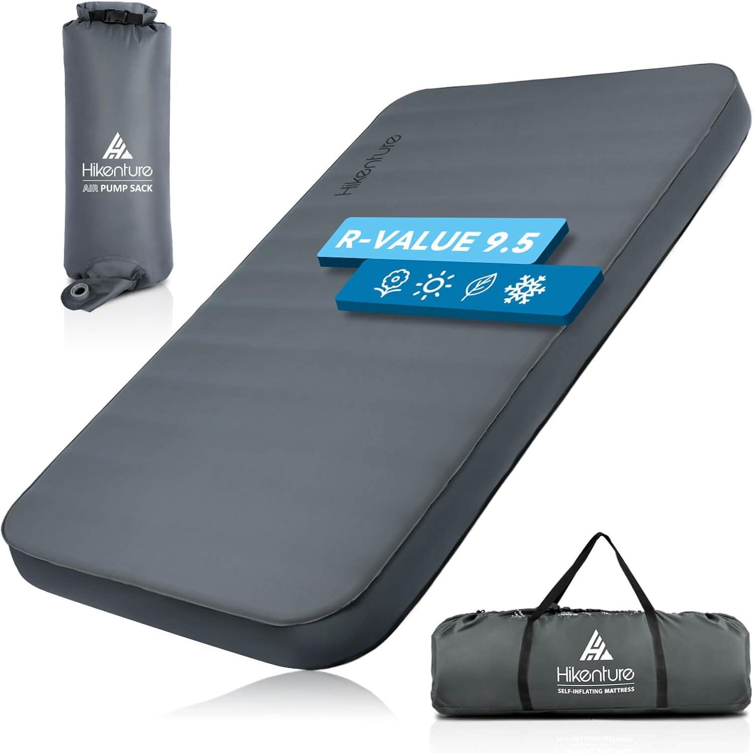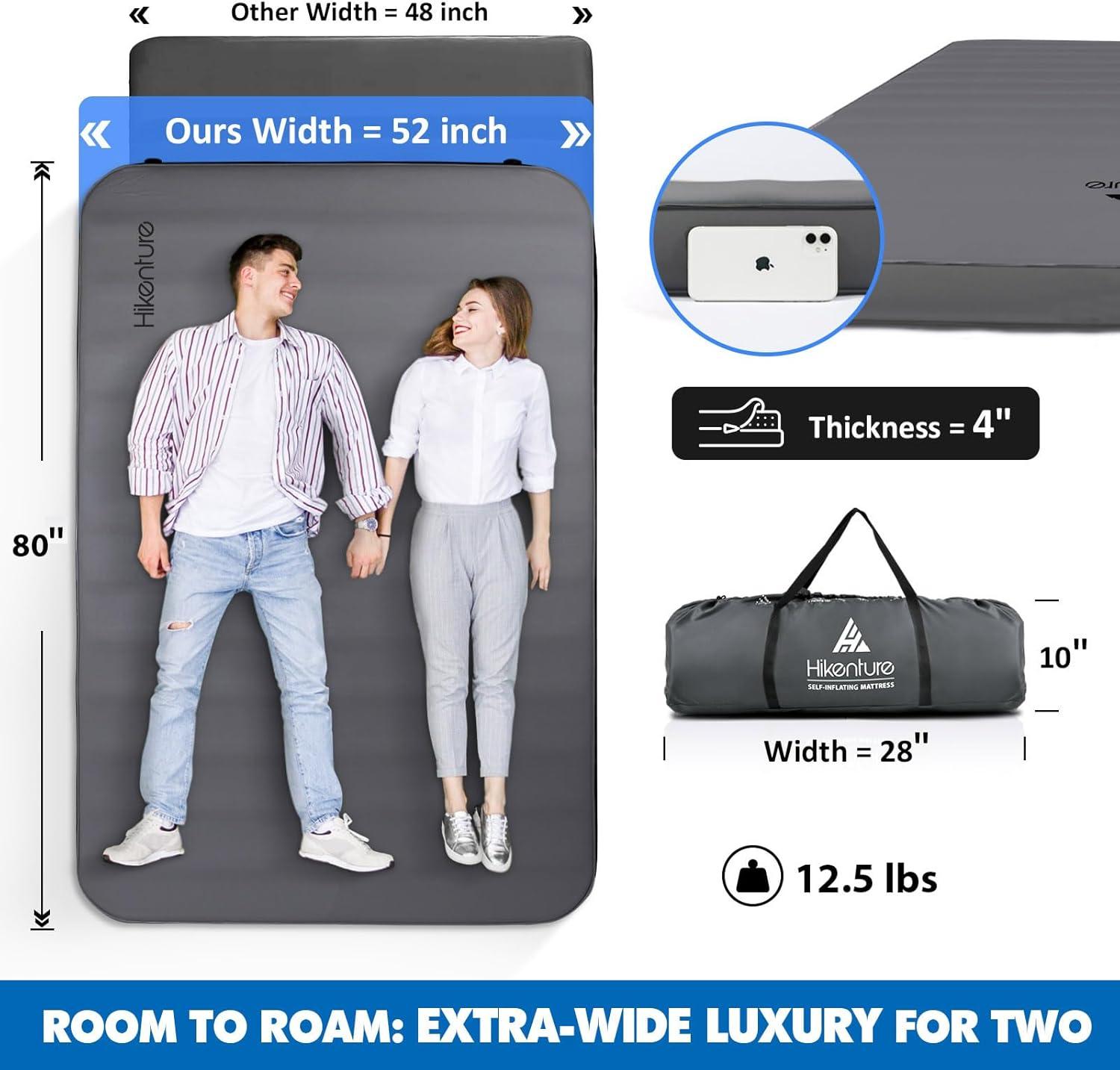 Hikenture Extra Thick Double Self Inflating Sleeping Pad, 9.5 R Camping Mattress 2 Person, Inflatable Foam Camping Pad with Pump Sack, Portable 4 in Thickness Comfort Plus Camping Mat for 4-Season(Grey)