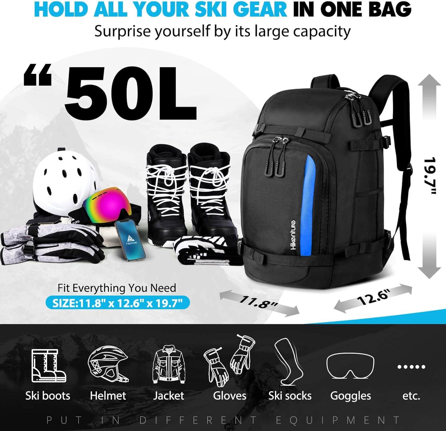 Hikenture Ski Boot Bag Backpack, 50L Padded Ski Bag & Snowboard Boot Bag with Drain Holes, Large Capacity Water-Resistant Ski Travel Bag for Ski Boots, Helmet, Goggles, Clothes, Gloves, Snowboard Gear(Blue)