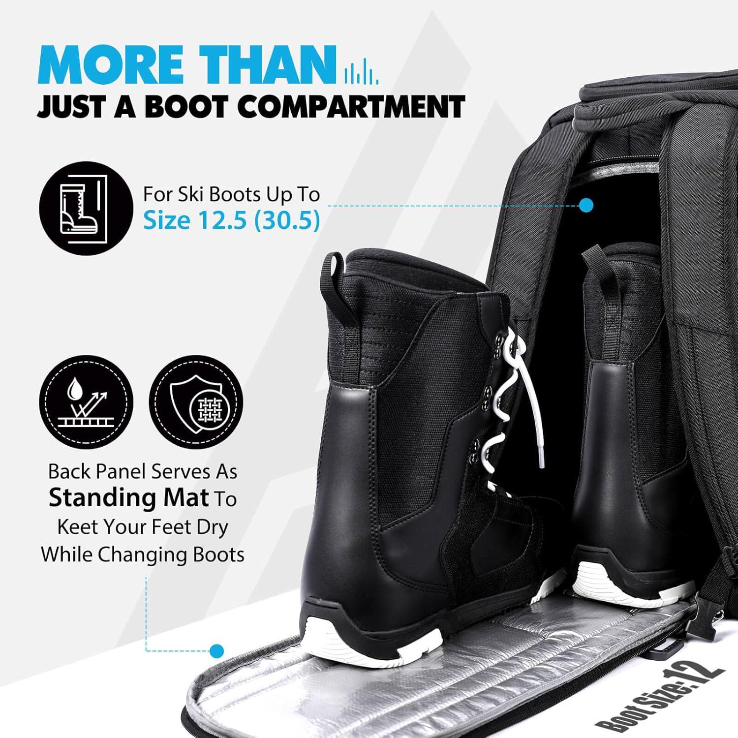 ๐ŸŽฟใ€๐’๐“๐€๐๐ƒ๐ˆ๐๐† ๐Œ๐€๐“ ๐ˆ๐๐‚๐‹๐”๐ƒ๐„๐ƒใ€‘Roomy boot compartment in the back fits ski boots up to size 12.5 (30.5). The inner side of its back panel door is reinforced with waterproof aluminum foil and could be used as standing mat in the outdoor to keep your feet dry while changing boots.