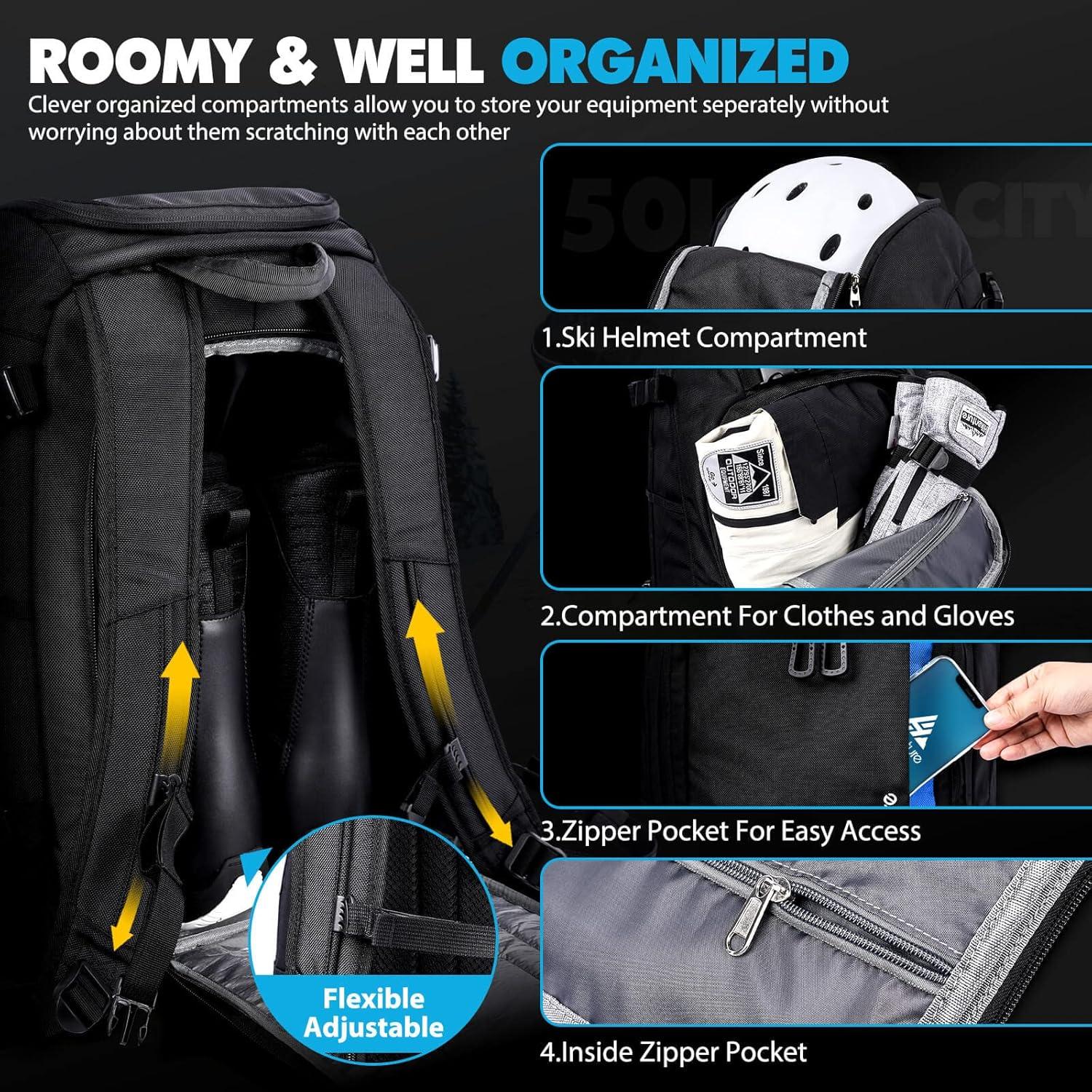 ๐ŸŽฟใ€๐Ž๐๐„ ๐๐€๐† ๐ˆ๐’ ๐„๐๐Ž๐”๐†๐‡ใ€‘We call it “ski boot bag”, but this ski bag of 50L capacity is actually much more than that. Maybe you could call it “ALL YOUR SKI GEAR BAG”, because it could indeed hold everything you need to take to the slopes: ski boots, helmet, gloves, clothes, goggles and more. Everything fit and nothing is bulging. Carry all your stuff with just one awesome snowboard boot bag!